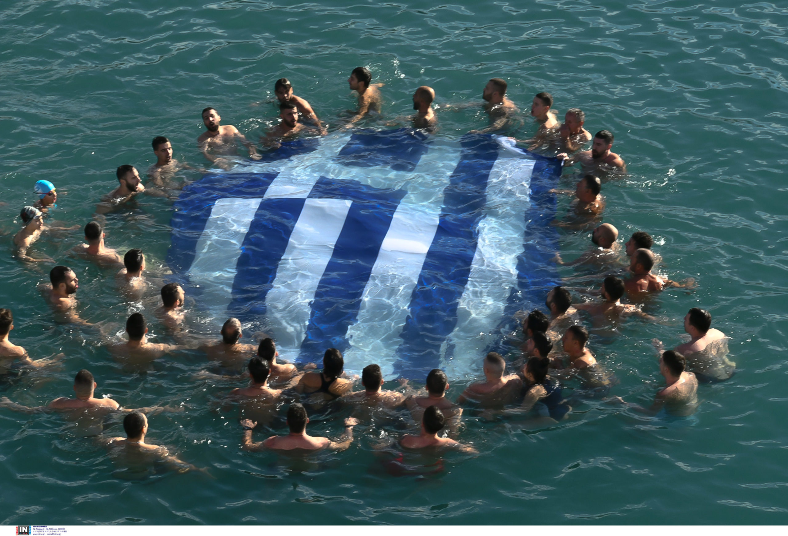 Η σημαία που άπλωσαν όσοι βούτηξαν για τον σταυρό κέρδισε το χειροκρότημα των πολιτών στην Πάτρα.