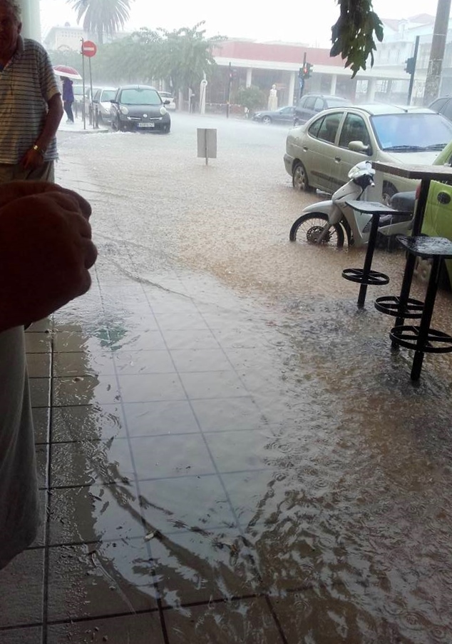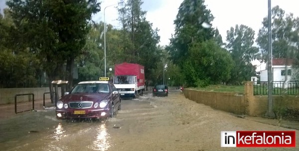Στο έλεος της κακοκαιρίας βρίσκεται η Κεφαλονιά. Η δυνατή νεροποντή κατάφερε μέσα σε λίγα λεπτά να μετατρέψει τους δρόμους σε ορμητικά ποτάμια που παρέσυραν στο διάβα τους αυτοκίνητα, τραπέζια, καρέκλες και ό,τι άλλο έβρισκαν μπροστά τους.