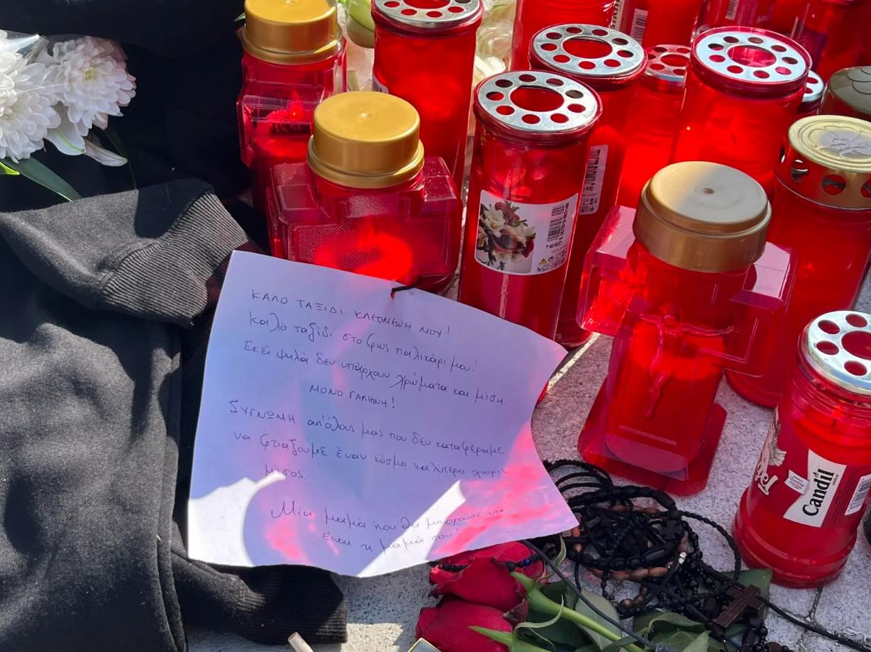 Το σημείο όπου κατέρρευσε έπειτα από τις μαχαιριές που δέχθηκε ο 20χρονος έχει γεμίσει με κεριά, λευκά λουλούδια και προσωπικά αντικείμενα που θυμίζουν την παρουσία του.