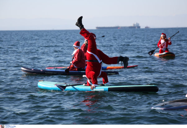 Σε μια δεύτερη δράση, άνδρες και γυναίκες φόρεσαν τις κόκκινες στολές και τους σκούφους του Άι Βασίλη και κωπηλάτησαν με τις σανίδες sup στον Θερμαϊκό Κόλπο, στο πλαίσιο του 4oυ SANTA SUP, που διοργάνωσε για τέταρτη συνεχή χρονιά η ομάδα ThesSup.gr που βρίσκεται στο Ναυτικό Όμιλο Θεσσαλονίκης, στην οδό Σοφούλη και διεξήχθη υπό την αιγίδα της Ομοσπονδίας Κανόε Καγιάκ. Αμέσως μετά τη «βόλτα» στη θάλασσα, υπήρχε στην παραλία ένας κουμπαράς για το «Χαμόγελο του Παιδιού» ώστε οι ενδιαφερόμενοι να προσφέρουν προαιρετικά ό,τι επιθυμούν.