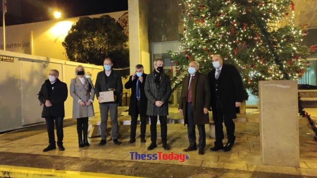 Υπό τους ήχους της Thessaloniki Youth Band άναψε το δέντρο και αμέσως μετά ο δήμαρχος αντάλλαξε δώρα με τον διοικητή του ΑΧΕΠΑ, την αντιδήμαρχο και το προσωπικό του νοσοκομείου.