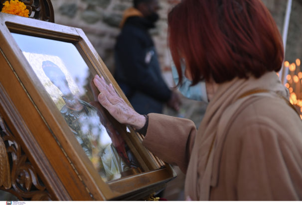 Για ακόμη μία ημέρα πιστοί παρά τα ισχυρά υγειονομικά πρωτόκολλα που έχουν τεθεί σε ισχύ με την υποχρεωτική χρήση της μάσκας, ασπάζονται τις εικόνες ακάλυπτοι.