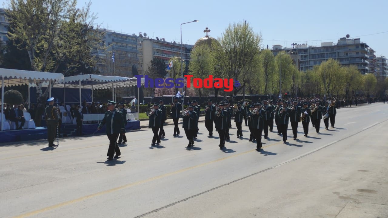 Η παρέλαση ξεκίνησε αρχικά με τη μπάντα του δήμου Θεσσαλονίκης και συνεχίστηκε με τον Πανελλήνιο Σύλλογο Απογόνων Μακεδονομάχων «Παύλος Μελάς». Χιλιάδες πολίτες που έχουν κατακλύσει τη Λεωφόρο Μεγάλου Αλεξάνδρου ξέσπασαν σε χειροκροτήματα, ενώ η πλειονότητα κρατά σημαίες με τα εθνικά σύμβολα.