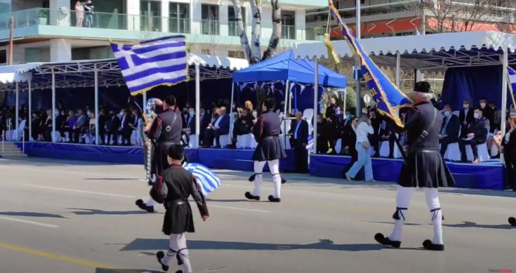 Η παρέλαση ξεκίνησε αρχικά με τη μπάντα του δήμου Θεσσαλονίκης και συνεχίστηκε με τον Πανελλήνιο Σύλλογο Απογόνων Μακεδονομάχων «Παύλος Μελάς». Χιλιάδες πολίτες που έχουν κατακλύσει τη Λεωφόρο Μεγάλου Αλεξάνδρου ξέσπασαν σε χειροκροτήματα, ενώ η πλειονότητα κρατά σημαίες με τα εθνικά σύμβολα.