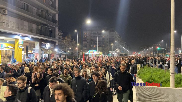 «Το έγκλημα αυτό δεν θα ξεχαστεί» φωνάζουν χιλιάδες άτομα στη Θεσσαλονίκη πραγματοποιώντας νέα πορεία για την συμπλήρωση ενός έτους από την τραγωδία των Τεμπών.