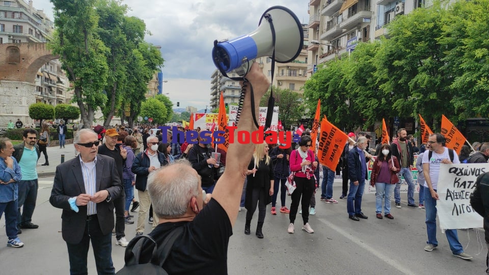 Σε άλλη συγκέντρωση στο άγαλμα του Βενιζέλου εργατικά σωματεία που συσπειρώνονται στο ΠΑΜΕ, μέλη του ΚΚΕ και της ΚΝΕ, τίμησαν τους αγωνιστές της εργατικής τάξης και ανέδειξαν τα αιτήματα της, καταγγέλλοντας την ακρίβεια και τον πόλεμο και ζητώντας καλύτερους μισθούς και συντάξεις, υγιεινή και ασφαλεια στην εργασία, εργασιακά και κοινωνικά δικαιώματα. Η συγκέντρωση ξεκίνησε με συναυλία μελών του παραρτήματος Θεσσαλονίκης του Πανελληνίου Συλλόγου Μουσικών και του Συλλόγου Μουσικών Β. Ελλάδος, που απηύθυναν κάλεσμα για την αντιπολεμική συναυλία, την οποία συνδιοργανώνουν στις 8 Μαϊου στην πλατεία Αριστοτέλους. Στη συγκέντρωση συμμετείχαν, μεταξύ άλλων, οι βουλευτές του ΚΚΕ, Λ. Στολτίδης και Γ. Δελής και αντιπροσωπεία του κόμματος.