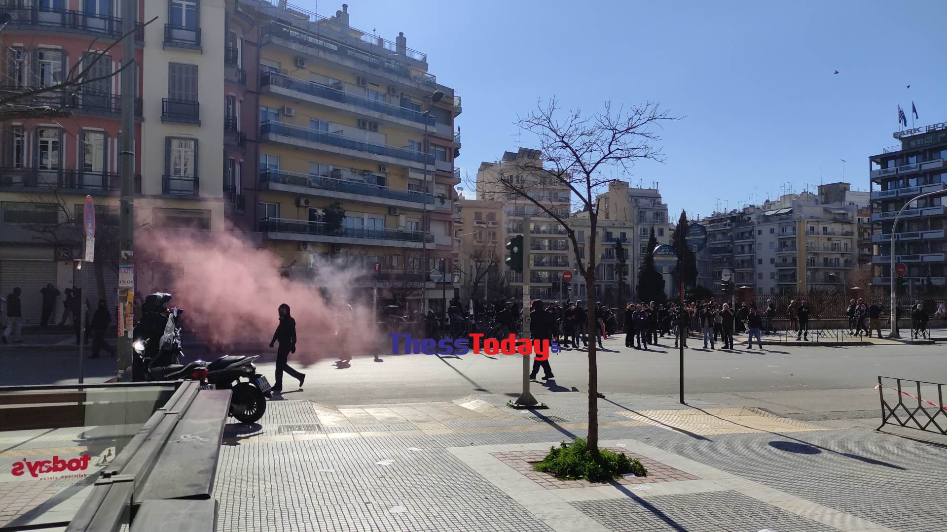 Δεύτερος γύρος επεισοδίων, έξω από το Υπουργείο Μακεδονίας Θράκης στη Θεσσαλονίκη, μεταξύ κουκουλοφόρων και δυνάμεων της αστυνομίας.