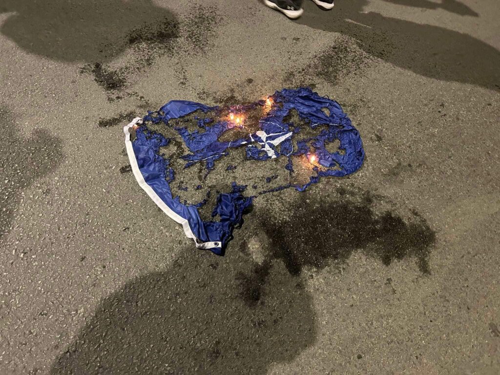 Στη συνέχεια, στο σημείο έφτασαν και οι συμμετέχοντες στη δεύτερη πορεία των μελών του αντιεξουσιαστικού χώρου και των κομμάτων της εξωκοινοβουλευτικής αριστεράς. Οι διαδηλωτές έκαψαν σημαίες των ΗΠΑ και του Ισραήλ και άναψαν καπνογόνα στα χρώματα της Παλαιστίνης.