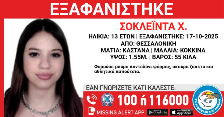 Τα ίχνη της Σοκλέϊντα Χ. χάθηκαν στις 17/10/25, στις 19:00 η ώρα. Το «Χαμόγελο του Παιδιού» ενημερώθηκε για την εξαφάνιση της ανήλικης σήμερα 21/10/25 και προχώρησε στη δημοσιοποίηση των στοιχείων της κατόπιν εισαγγελικής εντολής, καθώς ενδεχομένως να συντρέχουν λόγοι που θέτουν τη ζωή της σε κίνδυνο.