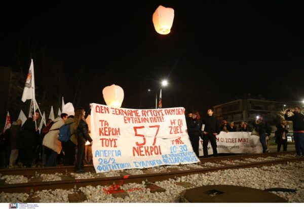 Φαναράκια άναψαν πάνω από τις σιδηροδρομικές γραμμές οι εργαζόμενοι μετά το τέλος της πορείας που πραγματοποίησαν στη Θεσσαλονίκη, πριν από λίγο στη μνήμη των θυμάτων που έχασαν τη ζωή τους πέρυσι στο σιδηροδρομικό δυστύχημα των Τεμπών.