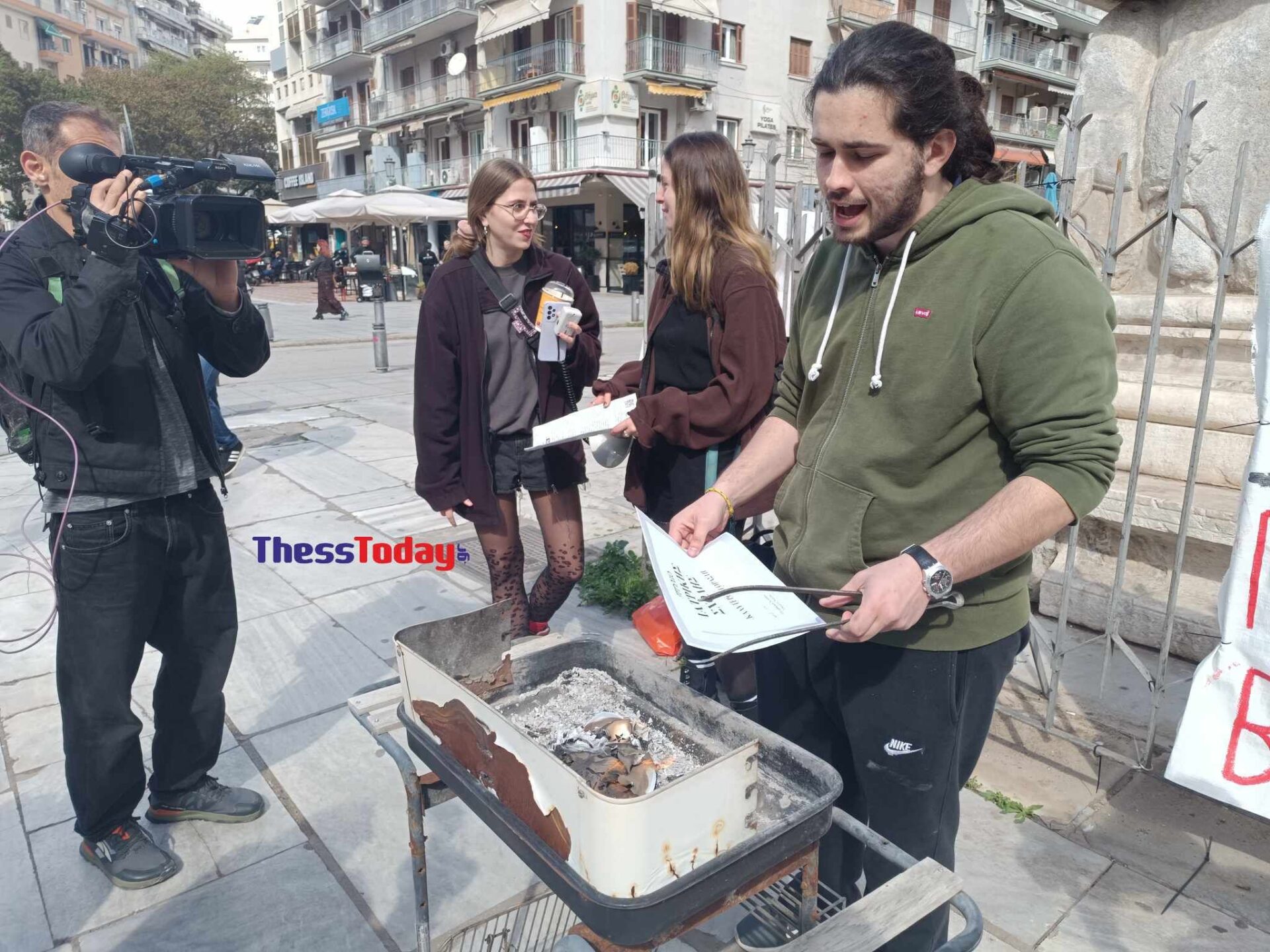 Οι φοιτητές με άρωμα… Τσικνοπέμπτης βάζουν συμβολικά φωτιά στα πτυχία τους, ενώ το «μενού» αποτελείται από σπουδές σε Σχολές του Αριστοτελείου Πανεπιστημίου Θεσσαλονίκης.
