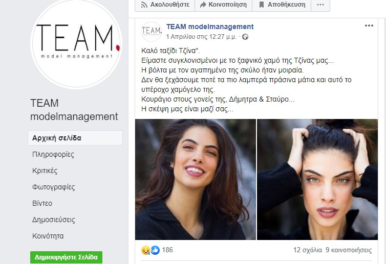 «Καλό ταξίδι Τζίνα. Είμαστε συγκλονισμένοι με το ξαφνικό χαμό της Τζίνας μας. Η βόλτα με τον αγαπημένο της σκύλο ήταν μοιραία. Δεν θα ξεχάσουμε ποτέ τα πιο λαμπερά πράσινα μάτια και αυτό το υπέροχο χαμόγελο της. Κουράγιο Δήμητρα και Σταύρο. Η σκέψη μας είναι μαζί σας» έγραψε στα social media το πρακτορείο μοντέλων, «Τeam Model Managment» με το οποίο συνεργαζόταν το θύμα που σπούδαζε οδοντιατρική στη Θεσσαλονίκη.