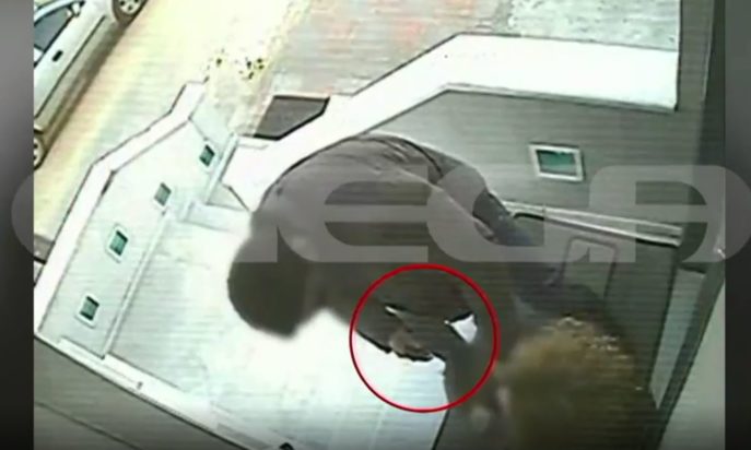 Ο άνδρας κρατάει στο δεξί του χέρι χειροπέδες, όμως η 44χρονη δεν το έχει αντιληφθεί και συνεχίζει κανονικά προς την είσοδο. Κρατά στα χέρια της τη τσάντα της, τον καφέ της, κάποιες σακούλες και το κινητό της τηλέφωνο. Αφήνει τον καφέ της στο πλάι και βγάζει τα κλειδιά για να ανοίξει τη πόρτα της εταιρίας.