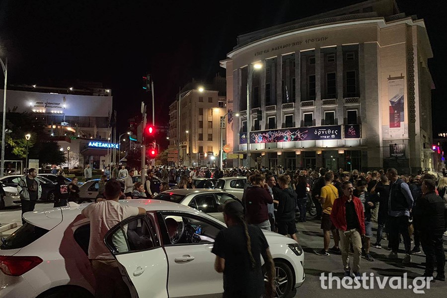 Οι καταστηματάρχες συγκεντρώθηκαν μπροστά από τον Λευκό Πύργο μετά το κλείσιμο των καταστημάτων τους τα μεσάνυχτα -τηρώντας τις αποστάσεις για την αποφυγή μετάδοσης του κορονοϊού- για να διαμαρτυρηθούν για το περιορισμένο ωράριο λειτουργίας που έχει επιβληθεί σε νόμους της χώρας, λόγω της πανδημίας.