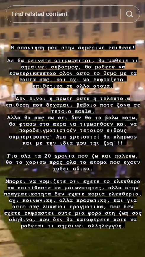 Μπορεί να νομίζετε ότι έχετε το ελεύθερο να επιτίθεστε σε μειονότητες, αλλά στην πραγματικότητα δεν έχετε καμία ελευθερία, όχι κοινωνική αλλά προσωπική, και για αυτό σας λυπάμαι πραγματικά, που δεν έχετε εκφραστεί ούτε μια φορά στη ζωή σας αληθινά, που δεν θα καταφέρετε ποτέ να μάθετε τι σημαίνει αλληλεγγύη», έγραψε επίσης στην ανάρτησή του λίγες ώρες μετά την επίθεση που δέχθηκε.