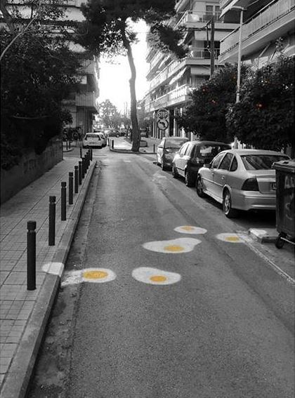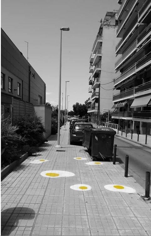 Περπατώντας στο κέντρο της Θεσσαλονίκης, με το βλέμμα σηκωμένο ψηλά, αντικρίζει κανείς εικόνες από γκράφιτι σε τοίχους κτιρίων με διάφορα σχέδια και μηνύματα. Υπάρχουν, όμως, και κάποιοι που περπατούν συνεχώς με το κεφάλι σκυμμένο πάνω από μια οθόνη κινητού… Σ’ αυτούς «απευθύνονται» τα… τηγανητά αυγά «μάτια» που υπάρχουν σε διάφορα πεζοδρόμια στο κέντρο, στη Βασ. Όλγας αλλά και σε άλλα τυχαία σημεία της πόλης. Μια αναπάντεχη συστάδα από γκράφιτι με κεντρικό «ήρωα» το τηγανητό αυγό που αιφνιδιάζει ευχάριστα.
