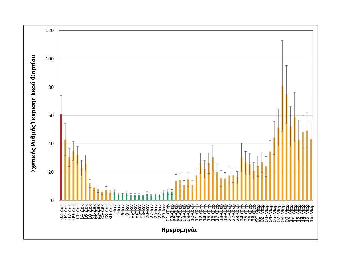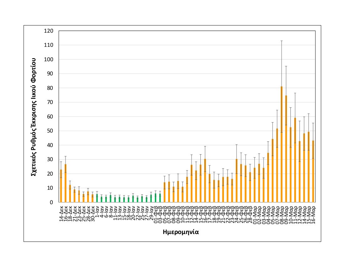 -Σταθερή (αύξηση μόλις 2%) σε σχέση με τη μέση τιμή των δύο αμέσως προηγούμενων μετρήσεων, δηλαδή της Παρασκευής 12/3 και της Κυριακής 14/3.