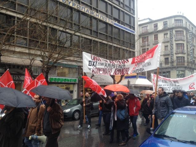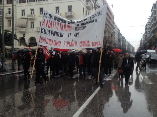 Συγκέντρωση και πορεία διαμαρτυρίας υπό βροχή πραγματοποίησαν στη Θεσσαλονίκη μέλη της Πρωτοβουλίας Συντονισμού Πρωτοβάθμιων Σωματείων Δημοσίου και Ιδιωτικού Τομέα ενάντια στο σχέδιο της κυβέρνησης για το νέο ασφαλιστικό.