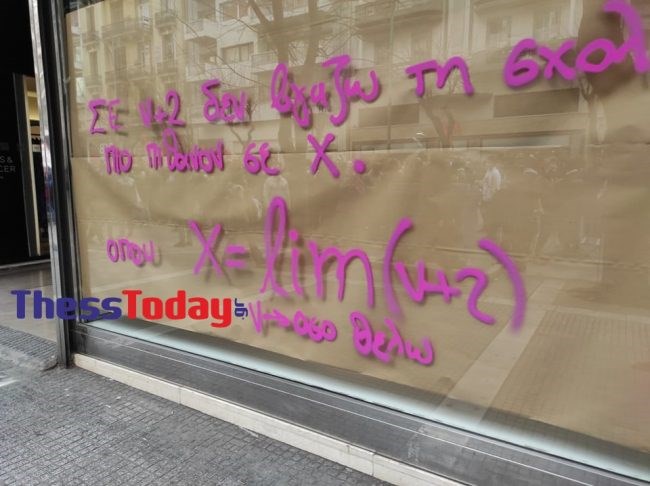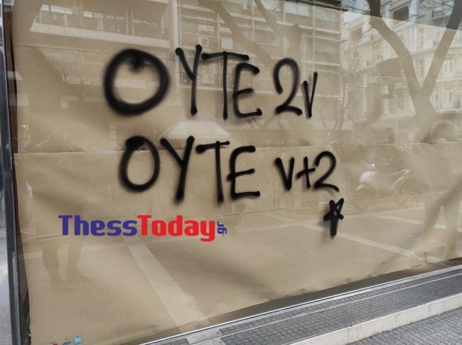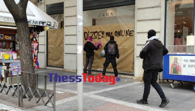 Την ώρα που ο κύριος όγκος των διαδηλωτών ήταν στην οδό Τσιμισκή, ομάδα αντιεξουσιαστών άρχισε να γράφει συνθήματα με μπογιές σε προσόψεις καταστημάτων.