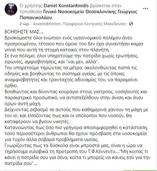 Ο Δανιήλ Κωνσταντινίδης κάνει λόγο για «υγειονομικό πόλεμο άνευ προηγουμένου, τέτοιου που όμοιο του δεν έχει συναντήσει καμία γενιά που αυτή τη στιγμή κατοικεί στον πλανήτη. Σε ένα πόλεμο, όλοι υπηρετούμε την πατρίδα χωρίς ερωτήσεις, ειρωνίες, αμφισβητήσεις, και “ναι μεν, αλλά”. Την υπηρετούμε τηρώντας τα μέτρα, ακολουθώντας πιστά τις οδηγίες και βοηθώντας το σύστημα υγείας, με τις όποιες αναμφισβήτητες και τρανταχτές αδυναμίες του, να παραμείνει όρθιο».