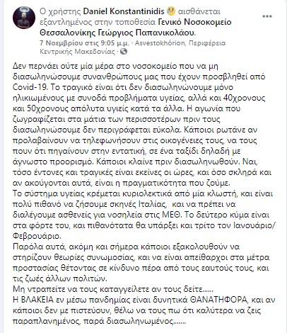 Κραυγή αγωνίας από γιατρό που εργάζεται στο «Γ. Παπανικολάου» της Θεσσαλονίκης με αναρτήσεις στον προσωπικό του λογαριασμό στο Facebook, σχετικά με την κατάσταση που επικρατεί στο νοσοκομείο.