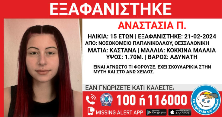 Την εξαφάνιση της 15χρονης Αναστασίας Π. από το νοσοκομείο “Γ. Παπανικολάου” στη Θεσσαλονίκη γνωστοποιεί με ανακοίνωσή του, το “Χαμόγελο του Παιδιού”.