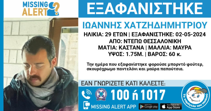 Missing alert για 29χρονο, ο οποίος εξαφανίστηκε στις 02/05/2024 και ώρα 14:00, από την περιοχή Ντεπώ Θεσσαλονίκης.