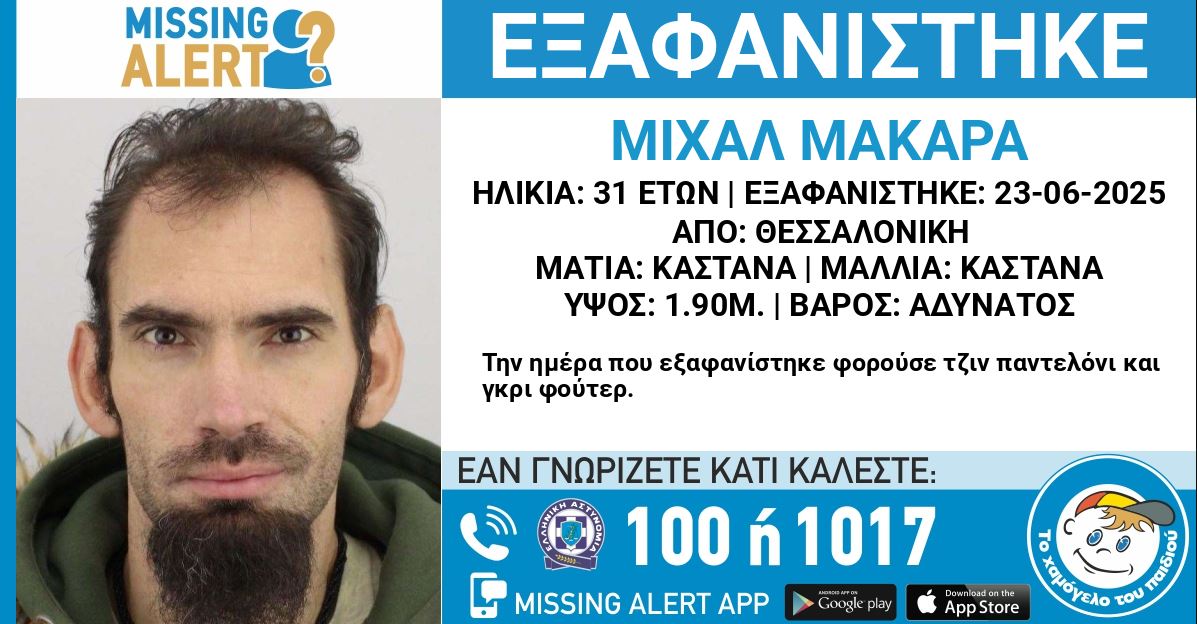 «Στις 23/06/2025, μεσημεριανές ώρες, εξαφανίστηκε από το κέντρο της Θεσσαλονίκης ο Μάκαρα Makara (επ.) Μιχάλ Michal (ον.), τσέχικης καταγωγής, 31 ετών. «Το Χαμόγελο του Παιδιού» ενημερώθηκε για την εξαφάνιση του σήμερα 27/05/2025 και προχώρησε στη δημοσιοποίηση των στοιχείων του, κατόπιν αιτήματος της οικογένειας του, καθώς ενδέχεται να συντρέχουν λόγοι οι οποίοι θέτουν τη ζωή του σε κίνδυνο. Ο Μάκαρα Makara (επ.) Μιχάλ Michal (ον.) έχει ύψος 1,90 μ., είναι αδύνατος έχει καστανά μαλλιά και καστανά μάτια. Την ημέρα που εξαφανίστηκε φορούσε τζιν παντελόνι και γκρι φούτερ».