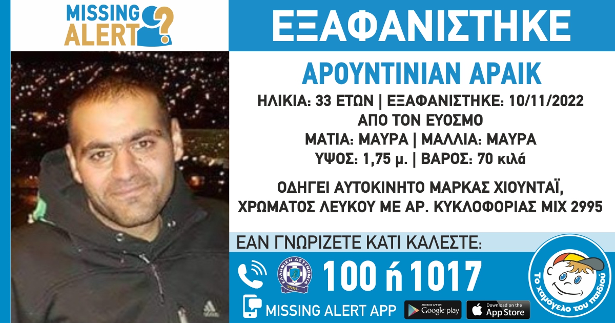 Συναγερμός έχει σημάνει στη Θεσσαλονίκη και συγκεκριμένα στον Εύοσμο για την εξαφάνιση του 33χρονου Αράικ Αρουντινιάν, τα ίχνη του οποίου αγνοούνται από τις 10 Νοεμβρίου 2022.
