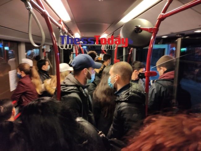 Ούτε καρφίτσα δεν έπεφτε σε λεωφορείο του ΟΑΣΘ το βράδυ του Σαββάτου στη Θεσσαλονίκη, το οποίο την ώρα της απαγόρευσης κυκλοφορίας γέμισε κόσμο που επέστρεφε σπίτι για την καραντίνα.
