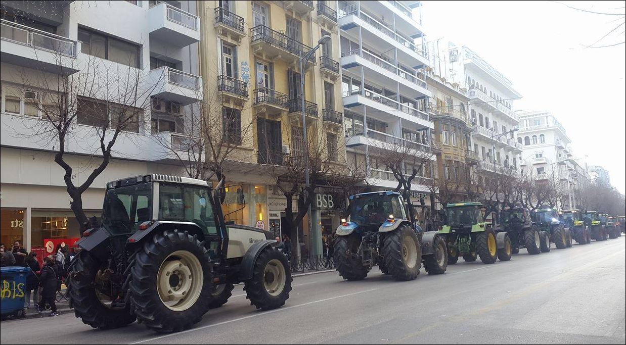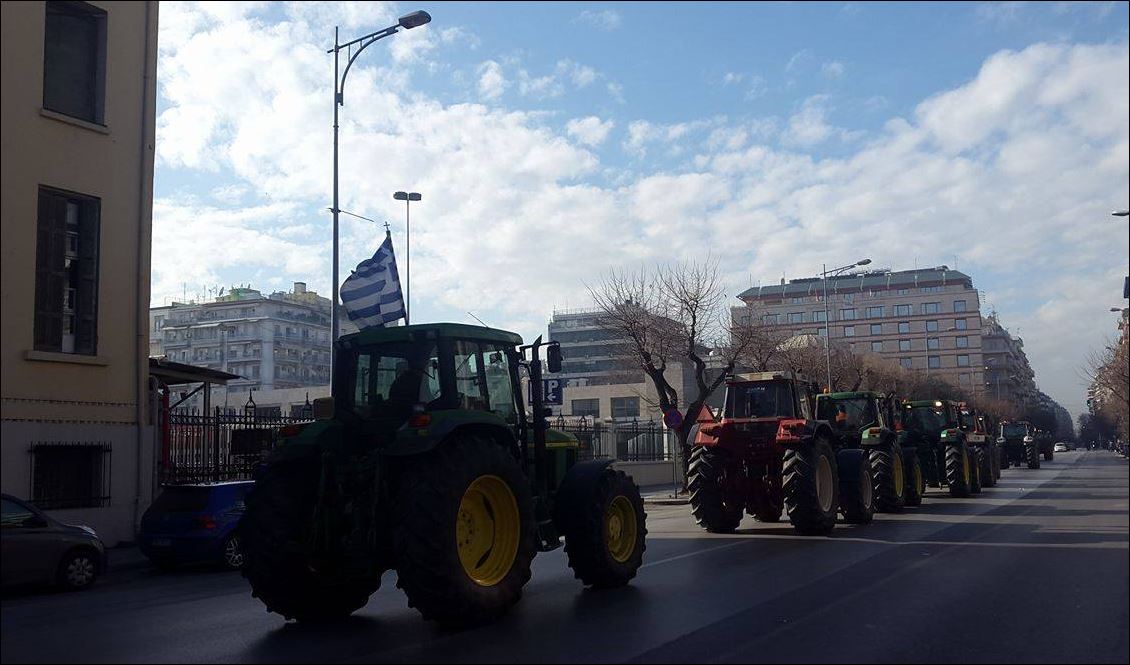 Οι αγρότες κινήθηκαν με τα τρακτέρ τους στην Γ’ Σεπτεμβρίου και μπήκαν στην οδό Τσιμισκή, απ’ όπου και θα συνεχίσουν προς τα διόδια των Μαλγάρων, όπου και έχουν στήσει το μπλόκο τους.