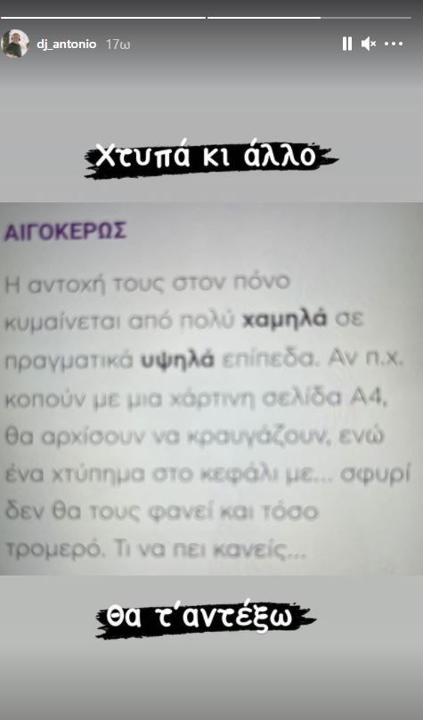 Τραγική ειρωνεία είναι ότι λίγες ώρες πριν χάσει τη ζωή του είχε κάνει ένα story στο Ιnstagram που αφορούσε στο ζώδιό του. “Η αντοχή τους στον πόνο κυμαίνεται από πολύ χαμηλά σε πραγματικά υψηλά επίπεδα” ανέφερε μεταξύ άλλων η ανάρτηση που είχε να κάνει με τα χαρακτηριστικά του Αιγόκερου. “Χτύπα κι άλλο θα τ’ αντέξω” έγραψε ο 48χρονος…