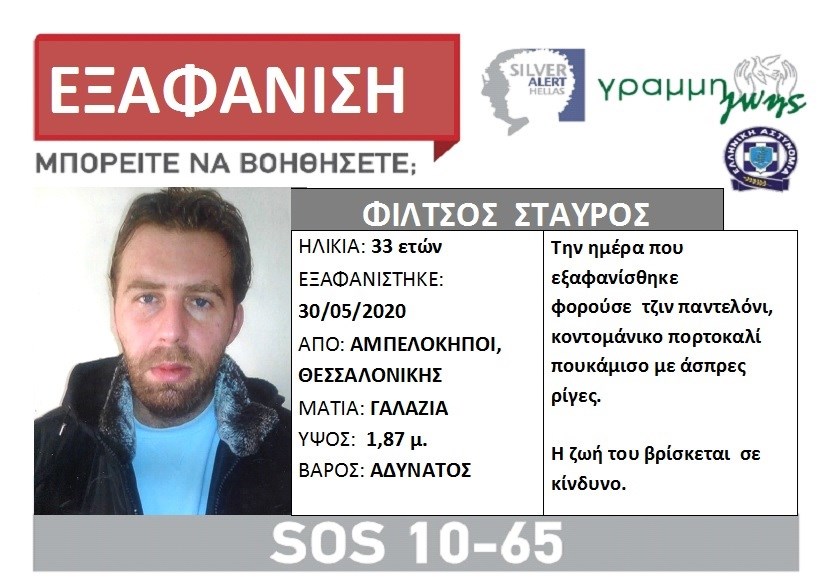 Ο λόγος για τον Σταύρο Φίλτσο, τα ίχνη του οποίου χάθηκαν το Σάββατο 30 Μαϊου. Ο 33χρονος είναι αδύνατος, έχει γαλάζια μάτια και ύψος 1,87 μ. Την ημέρα που εξαφανίστηκε φορούσε τζιν παντελόνι και κοντομάνικο πορτοκαλί πουκάμισο με άσπρες ρίγες. Ήδη εκδόθηκε silver alert από τη «Γραμμή Ζωής», όπου αναφέρεται ότι η ζωή του βρίσκεται σε κίνδυνο.