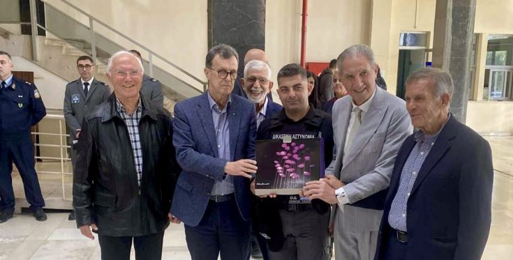 Αναμνηστικό δώρο απένειμαν στον αστυνομικό οι βετεράνοι ποδοσφαιριστές της Θεσσαλονίκης Κώστας Αϊδινίου, Κούλης Αποστολίδης, Γιάννης Βένος και Ντίνος Κούης, σύμφωνα με το ΑΠΕ-ΜΠΕ.