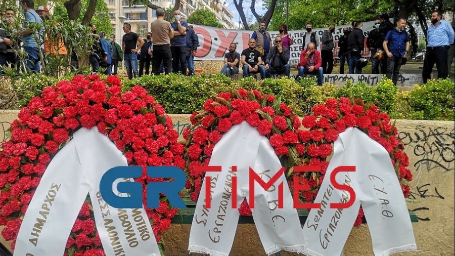 Ακολούθησαν καταθέσεις στεφανιών εκ μέρους της ΓΣΕΕ, του ΕΚΘ, συνδικαλιστικών παρατάξεων και Δήμων. Το ΕΚΘ έχει κηρύξει 24ωρη απεργία για σήμερα, στην οποία συμμετέχουν και οι εργαζόμενοι στις αστικές συγκοινωνίες και τα λεωφορεία του ΟΑΣΘ κινούνται μόνο με το προσωπικό ασφαλείας.