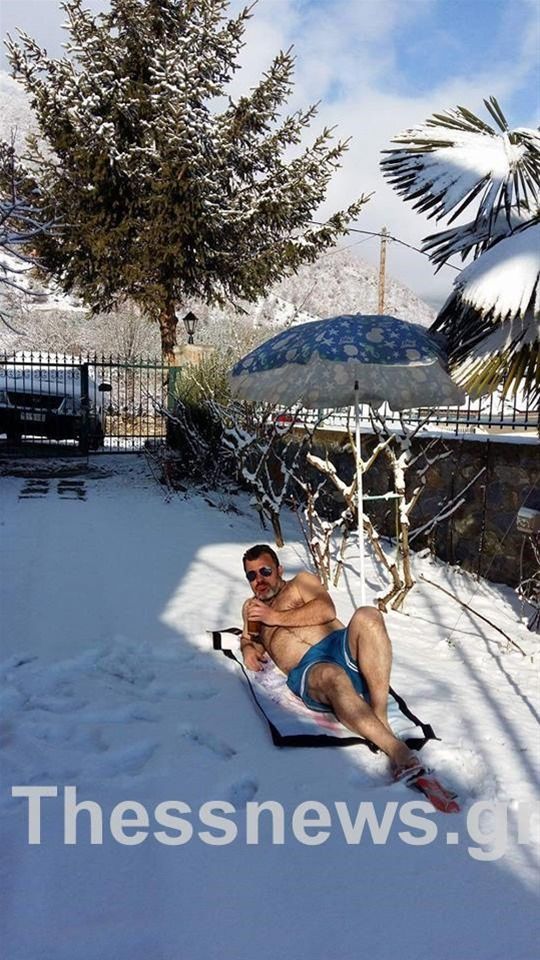 Ο λόγος για έναν Θεσσαλονικιό, ο οποίος φόρεσε το μαγιό του, έστρωσε την πετσέτα του στο χιόνι και απόλαυσε τον φραπέ του.