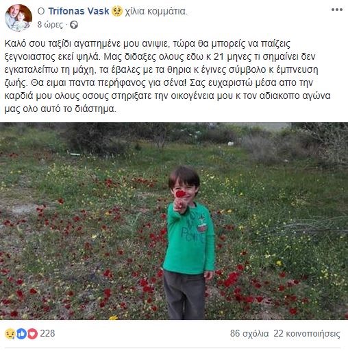 Με ανάρτησή του στο facebook, o θείος του αγοριού ανακοίνωσε τα ξημερώματα της Τρίτης το θάνατο του αγοριού.