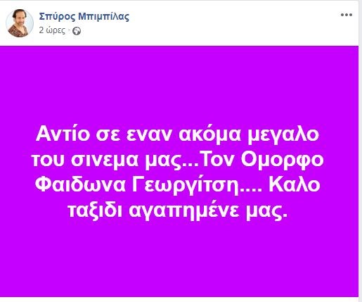 Ο Σπύρος Μπιμπίλας εξέφρασε τη λύπη του στο facebook όπου είπε το δικό του “αντίο” στον γόη του ελληνικού κινηματογράφου. “Αντίο σε έναν ακόμη μεγάλο του σινεμά μας… Τον όμορφο Φαίδωνα Γεωργίτση… Καλό ταξίδι αγαπημένε μας” έγραψε ο ηθοποιός.