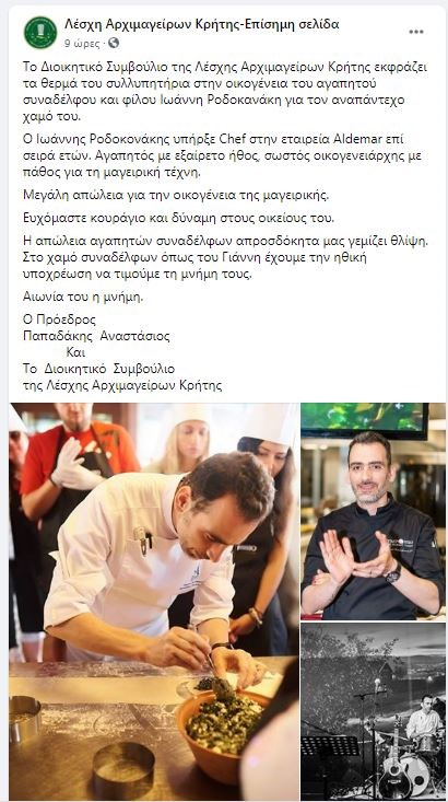 “Το Διοικητικό Συμβούλιο της Λέσχης Αρχιμαγείρων Κρήτης εκφράζει τα θερμά του συλλυπητήρια στην οικογένεια του αγαπητού συναδέλφου και φίλου Ιωάννη Ροδοκανάκη για τον αναπάντεχο χαμό του.