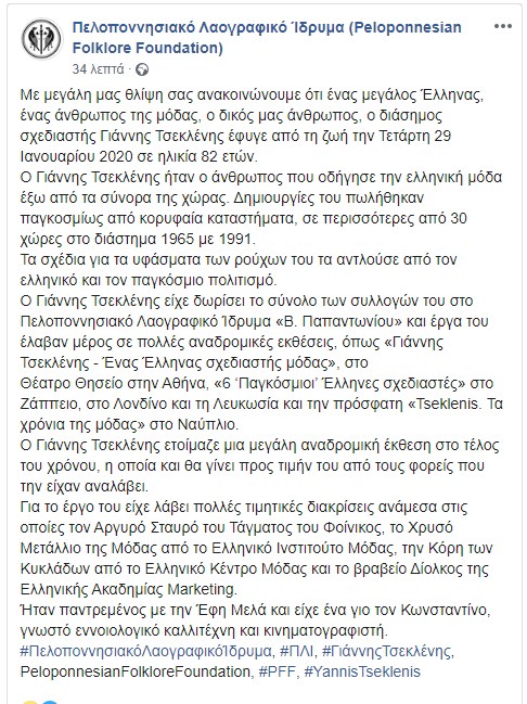 Τη δυσάρεστη είδηση γνωστοποίησε με ανάρτησή του στο facebook το Πελοποννησιακό Λαογραφικό Ίδρυμα τονίζοντας ότι ο Γιάννης Τσεκλένης έφυγε από τη ζωή την Τετάρτη 29 Ιανουαρίου. Όπως σημειώνεται ο σχεδιαστής ετοίμαζε μια μεγάλη αναδρομική έκθεση στο τέλος του χρόνου, η οποία και θα γίνει προς τιμήν του από τους φορείς που την είχαν αναλάβει.