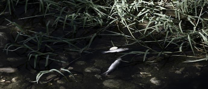 Τις τελευταίες ημέρες, εξαιτίας της ρύπανσης από την πετρελαιοκηλίδα, τα ψάρια δεν επέστρεψαν στη θάλασσα και εγκλωβίστηκαν στο ρέμα.