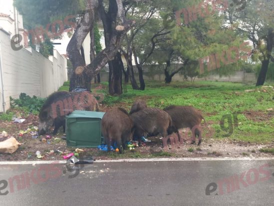 Όπως μπορείτε να δείτε στις φωτογραφίες που έστειλε αναγνώστης του enikos.gr, μία αγέλη από αγριογούρουνα φαίνεται πως αναζητά τροφή σε κάδους σκουπιδιών.