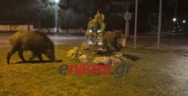 Όπως βλέπουμε στα στιγμιότυπα, οι αγριόχοιροι ψάχνουν κάτι για να ξεγελάσουν την πείνα τους, σε χώρο που βρίσκεται σε κοντινή απόσταση από την πλατεία.