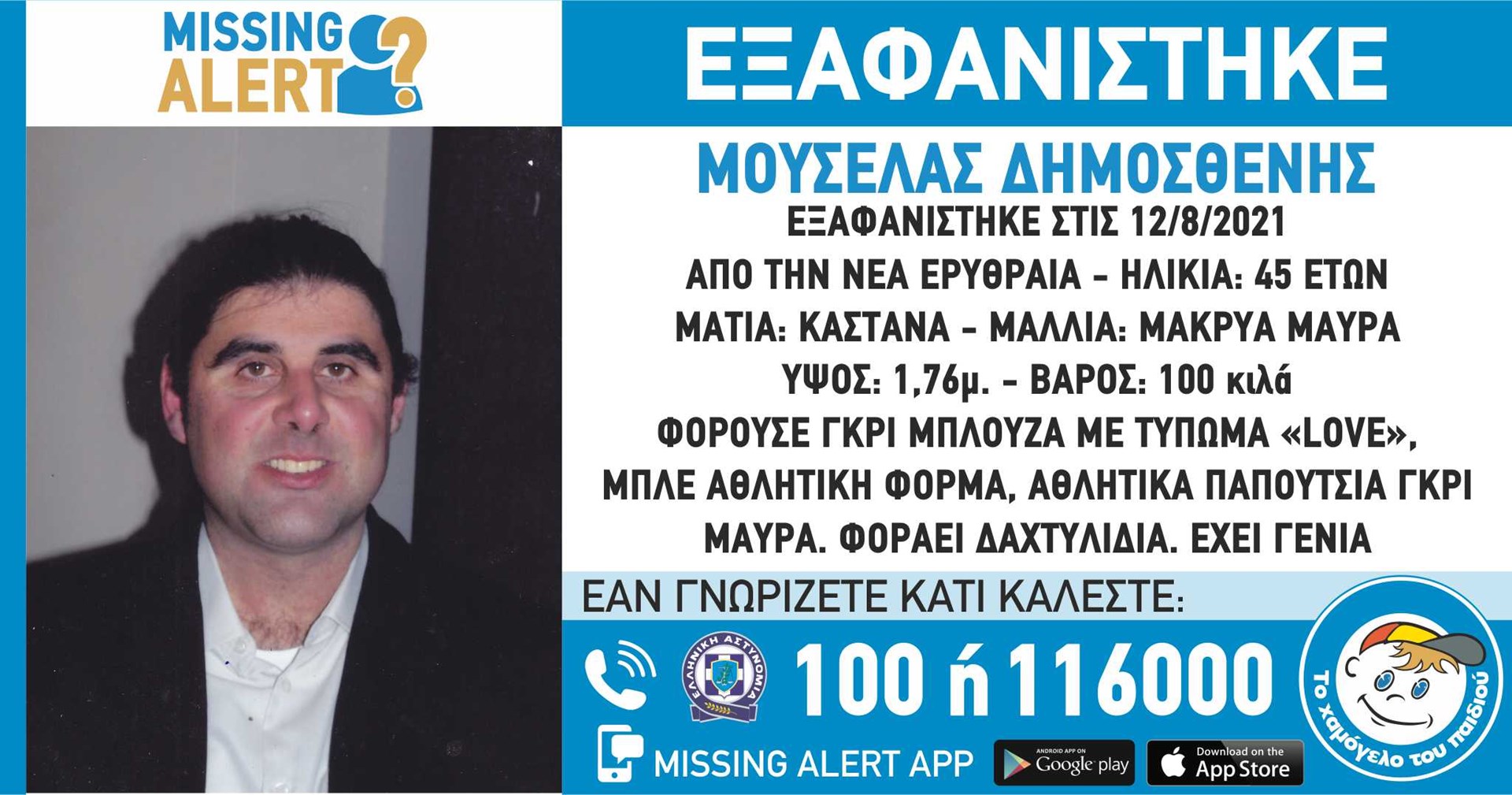 Στις 12/08/2021, βραδινές ώρες, εξαφανίστηκε από την περιοχή της Νέας Ερυθραίας, ο Μουσέλας Δημοσθένης, 45 ετών. Το «Χαμόγελο του Παιδιού» ενημερώθηκε για την εξαφάνιση του Μουσέλα Δημοσθένη σήμερα, 16/8/2021, και προχώρησε στη δημοσιοποίηση των στοιχείων του ενήλικου, κατόπιν αιτήματος της οικογένειας του, καθώς ενδέχεται να συντρέχουν λόγοι οι οποίοι θέτουν τη ζωή του σε κίνδυνο. Ο Μουσέλας Δημοσθένης έχει ύψος 1,75 μ., έχει 100 κιλά βάρος, έχει μαύρα μακριά μαλλιά και καστανά μάτια. Φορούσε γκρι μπλούζα με τύπωμα «love», μπλε αθλητική φόρμα, γκρι – μαύρα αθλητικά παπούτσια. Φοράει δαχτυλίδια και έχει γένια.