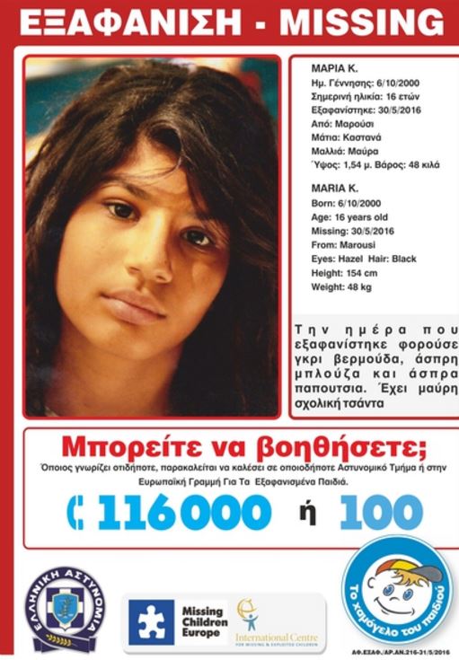Συναγερμός έχει σημάνει στην αστυνομία μετά την εξαφάνιση 16χρονης στο Μαρούσι. Σύμφωνα με ανακοίνωση του «Χαμόγελου του Παιδιού» η Μαρία Κ. εξαφανίστηκε λίγο μετά τις 10.00 το βράδυ της Δευτέρας.