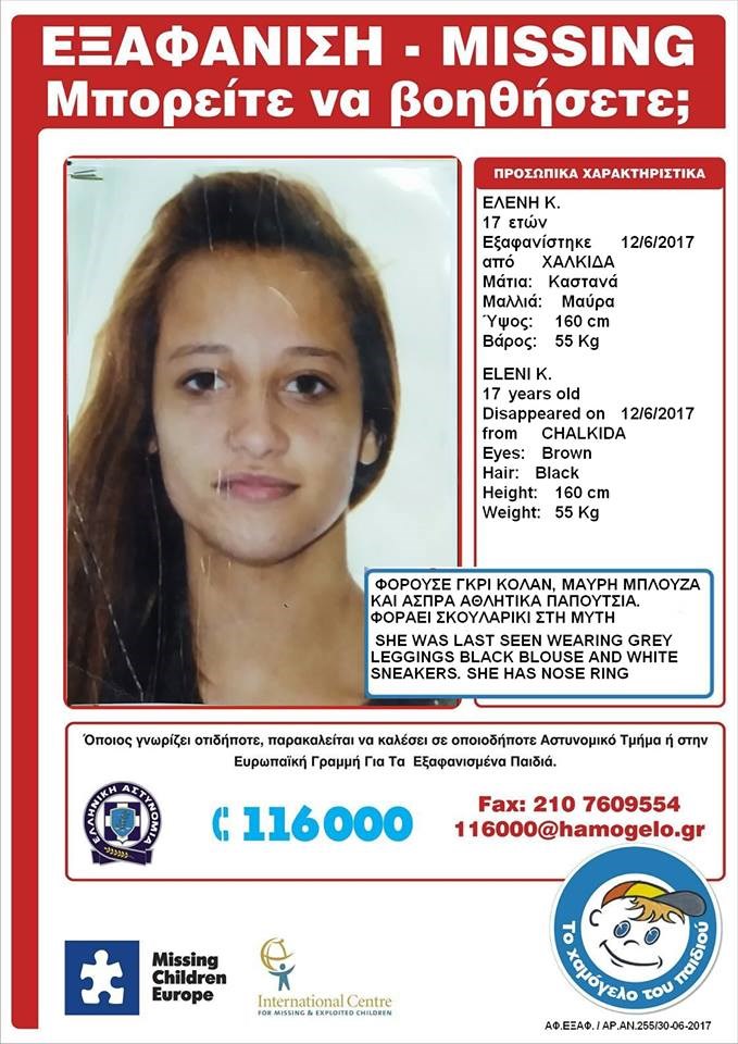 Τη συνδρομή των πολιτών για τον εντοπισμό του 17χρονης Ελένης Κ., η οποία εξαφανίστηκε στις 12 Ιουνίου από την Χαλκίδα, ζητά με ανακοίνωσή του το Χαμόγελο του Παιδιού.