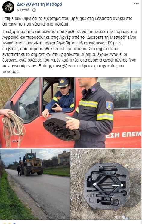 Σύμφωνα με ανάρτηση στο facebook της ομάδας Δια-SOS-τε τη Μεσαρά, το εξάρτημα αυτοκινήτου που βρέθηκε πριν από λίγα λεπτά στην παραλία του Αφραθιά Τυμπακίου να … επιπλέει στη θάλασσα ανήκε στο αυτοκίνητο στο οποίο επέβαιναν οι τέσσερις αγνοούμενοι όταν παρασύρθηκαν από τα ορμητικά νερά του Γεροποτάμου.
