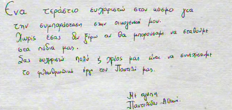 «Ένα τεράστιο ευχαριστώ στον κόσμο για την συμπαράσταση στην οικογένεια μου… Χωρίς εσάς δεν ξέρω αν θα μπορούσαμε να σταθούμε στα πόδια μας… Σας ευχαριστώ πολύ και χρέος μας είναι να συνεχίσουμε το φιλανθρωπικό έργο του Παντελή μας… Με αγάπη, Παντελίδου Αθήνα», έγραψε χαρακτηριστικά.