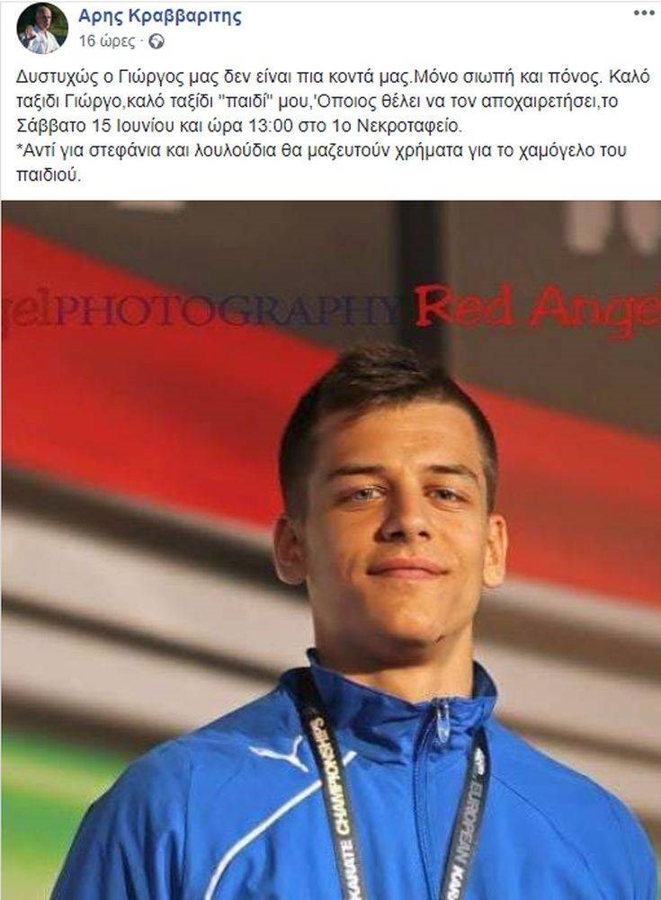 «Δυστυχώς ο Γιώργος μας δεν είναι πια κοντά μας. Μόνο σιωπή και πόνος. Καλό ταξίδι Γιώργο, καλό ταξίδι ”παιδί” μου,’Όποιος θέλει να τον αποχαιρετήσει,το Σάββατο 15 Ιουνίου και ώρα 13:00 στο 1ο Νεκροταφείο. Αντί για στεφάνια και λουλούδια θα μαζευτούν χρήματα για το χαμόγελο του παιδιού», έγραψε στo Facebook.