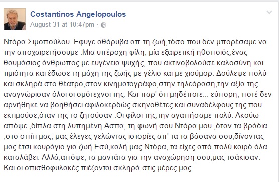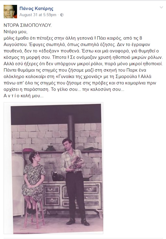 Συγκλονισμένος από τον χαμό της Ντόρας Σιμοπούλου, είναι και ο ηθοποιός Πάνος Κατέρης, ο οποίος (επίσης μέσω Facebook) έγραψε: